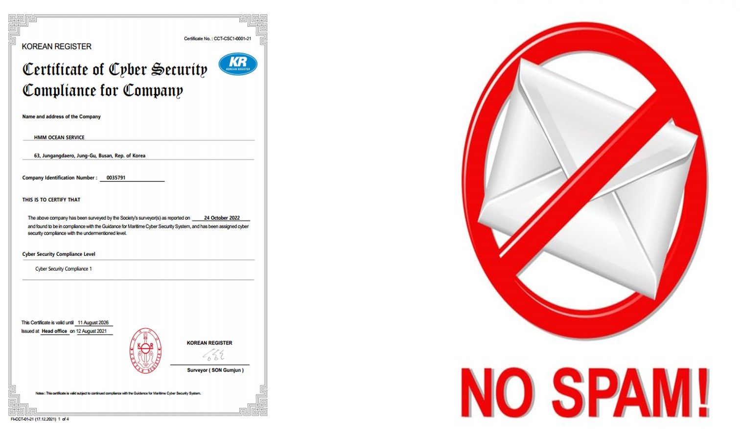 IMO가 사이버 리스크 관리에 관한 이행사항을 권고함으로써 사이버 리스크 관리에 대한 중요성이 커지고 있다. 이에, 지난 2021년 8월 12일 KR에서 Cyber Security Compliance 1 level(KR CS1)의 회사 사이버보안 최초 인증을 받았다. 해당 수준의 인증은 기본적인 사이버보안 시스템을 운용중인 수준을 의미하며 TMSA 3, SIRE 및 Rightship 검사에 대응 가능하다. 해당 인증을 받기 위해 물리적 보안 이행 상태, 사이버자산 리스크 평가 보고서, 리스크 관리 계획서의 이행 상태 등 준비를 연내에 지속적으로 실시 중이다. 2022년 10월 24일 연차인증검사를 수행했고, 이후 조치사항 식별하여 올해 연차인증검사 시 보완 예정이다.