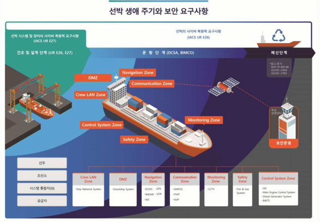건조·설계 단계와 운항 단계에 적용되는 시스템 및 보안 규정은 아래 그림과 같다. 이 문서는 한국인터넷진흥원 홈페이지에서 다운로드할 수 있다.