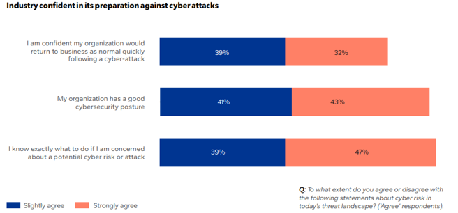 DNV의 조사에 의하면, 해양 산업 전문가 10명 중 8명 이상(83%)이 조직이 사이버보안에 대한 대응을 잘 갖추고 있다고 답했고, 10명 중 7명(71%)은 조직이 사이버 공격에 당하면