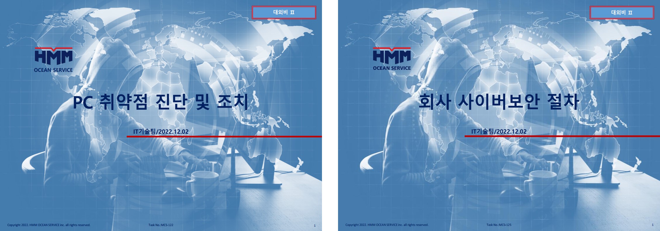 IMO에서 안전관리시스템 내 해사사이버보안 리스크 관리 포함 결의안을 채택하면서 2021.1.1 이후 DOC심사에서 SMS에 사이버 리스크 관리를 포함해야 한다. 이에 따라 글로벌 강행 규정 준수 및 Cyber Attack 대응력 강화를 위해 절차서를 신규 제정하였다. 현재 선박에 지속 보급 중이며 선박 사이버보안 절차서와 함께 사이버보안 원격검사 sample 영상이 포함된 절차 관련 USB 배포하여 선박 사이버보안 인식 향상 및 선원 교육에 힘쓰고 있다.