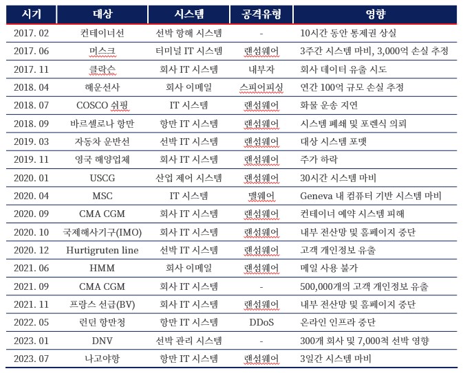2017년 세계 최대 해운사 머스크(Maersk)의 시스템이 랜섬웨어 공격을 받아 전세계에서 운영하는 항만 터미널 IT 시스템과 운영통제 시스템이 마비됐다. 3주 동안 화물 선적과 하역 작업이 모두 중단됐다. 뿐만 아니라 2018년에는 바르셀로나항, 미국 센디에이고항 등 항만 관제에서 약 2주간의 사이버 공격으로 홈페이지가 마비되고 관리체계가 무너진 사례도 있다.